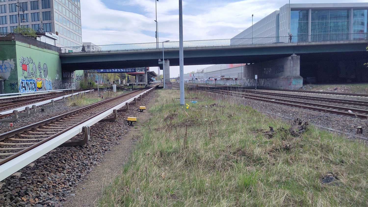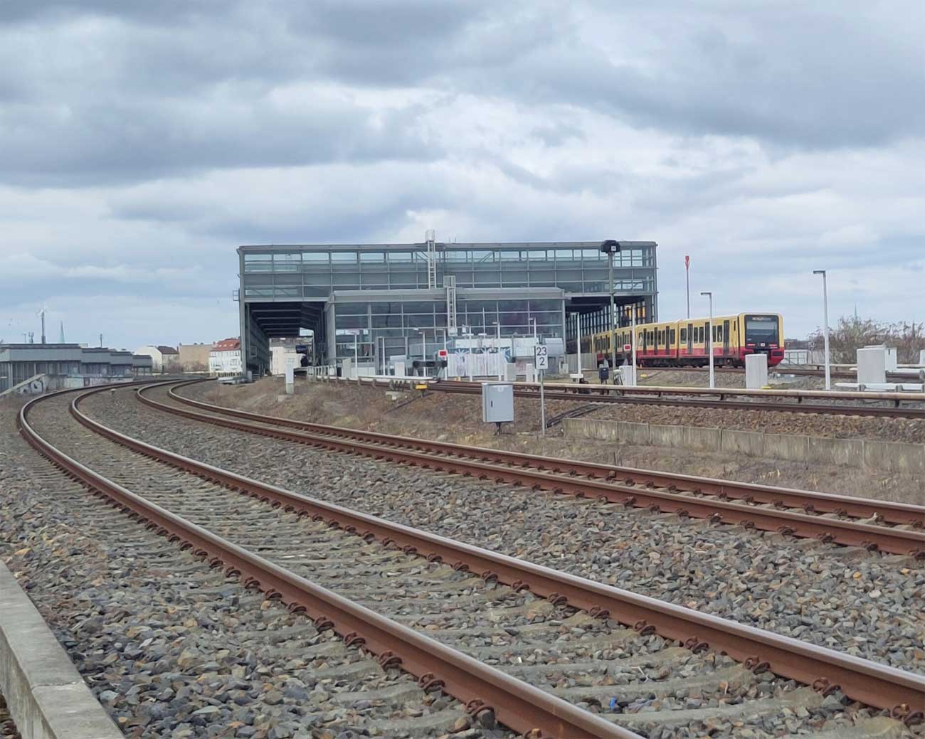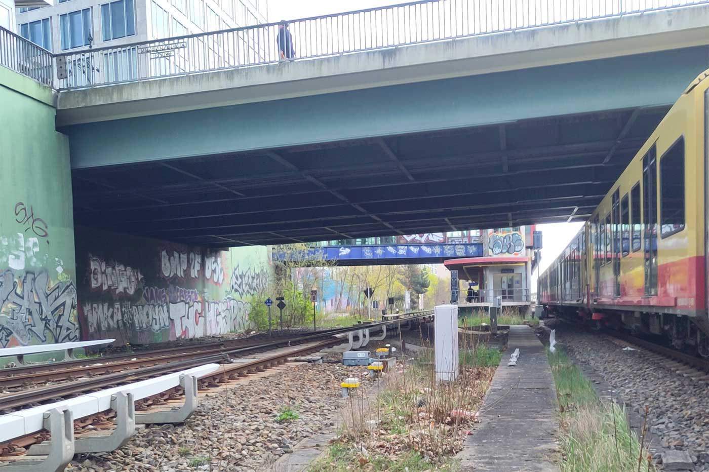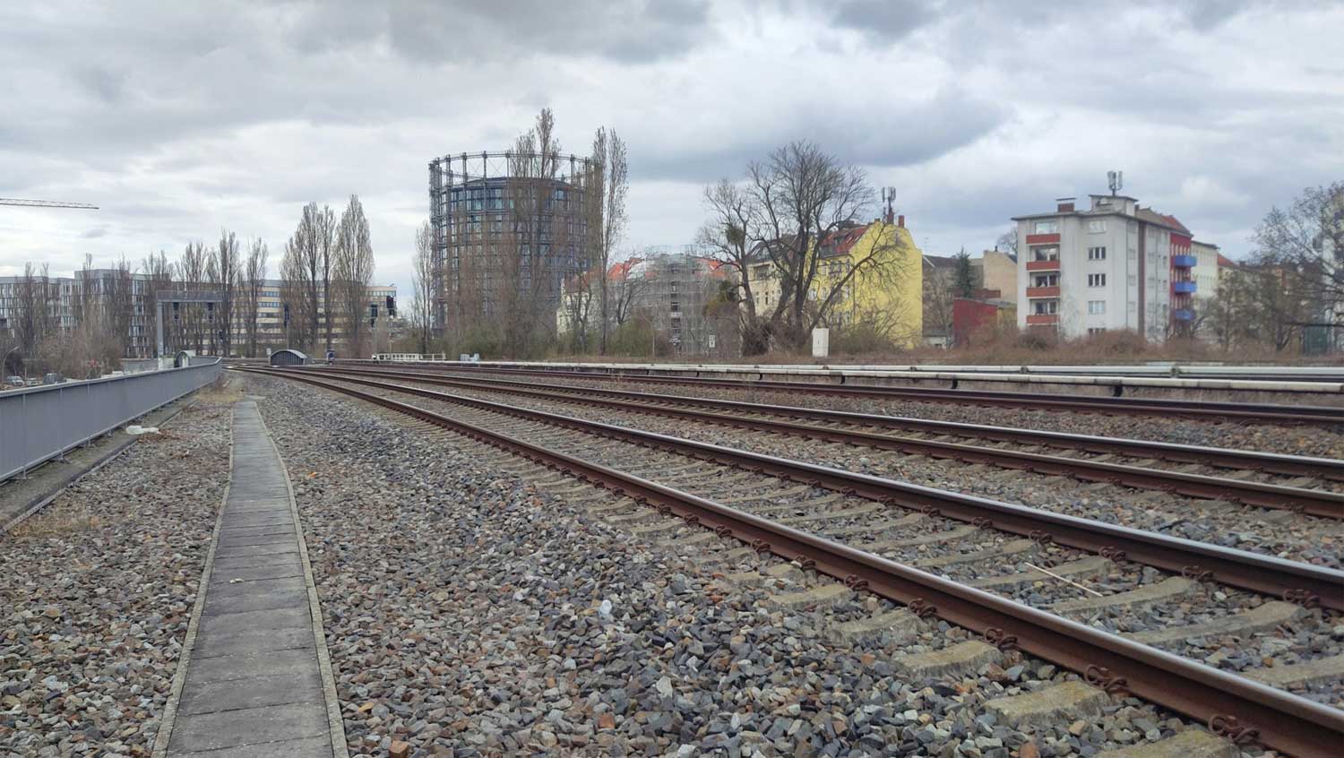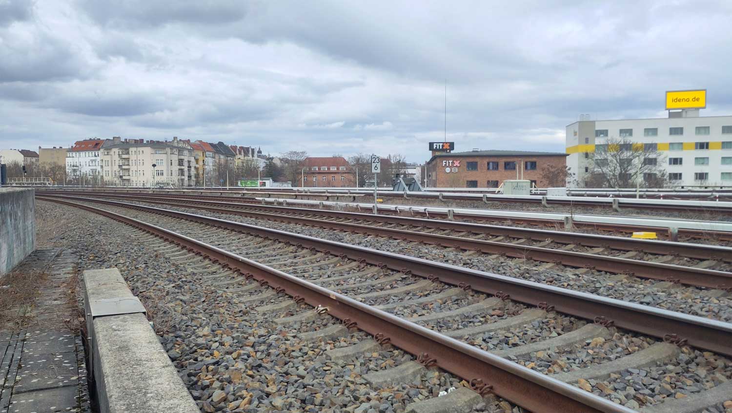 Links die Gleise der S-Bahn der Ringbahn mit km 22,8