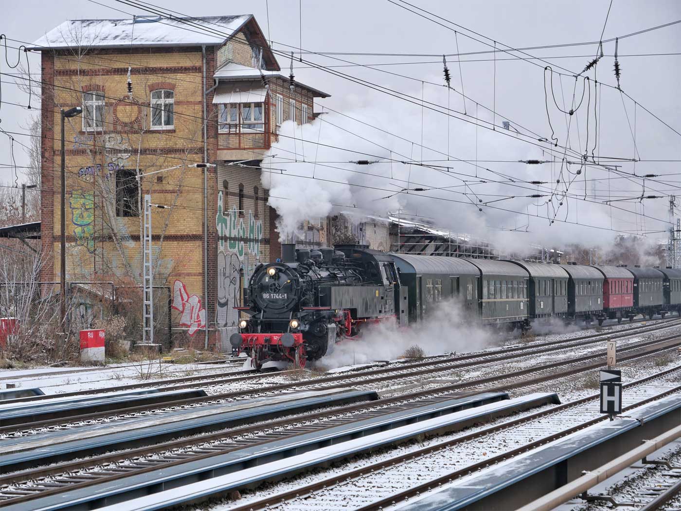 Im Hintergrund Stellwerk Hsb
