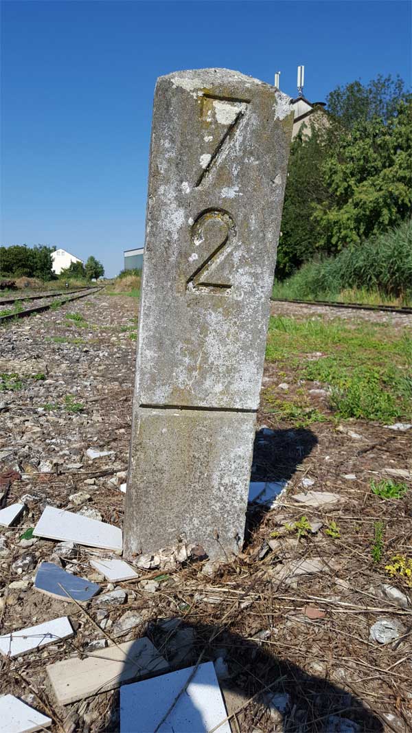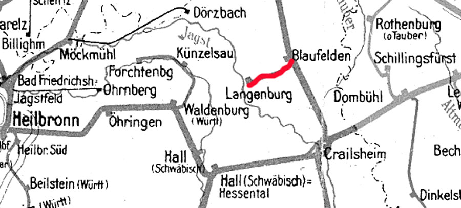 Blaufelden 0,0 km 22,21 der Strecke Crailsheim 0,0 - Weikersheim 47,88 - Bad Mergentheim 58,99 - ehemalige Grenze Königlich Württembergische Staats-Eisenbahnen/Großherzoglich Badische Staatseisenbahnen km 60,282 = [km 6,109 - Königshofen (Baden) 0,0]