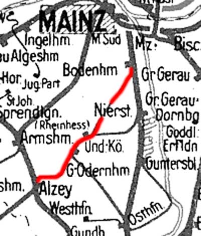 Gau Odernheim | 22,11 | km 0,0 der Strecke Gau Odernheim 0,0 - Dittelsheim-Heßloch 9,28 - Streckenunterbrechung - Monzernheim 12,47 - Osthofen 18,76 |