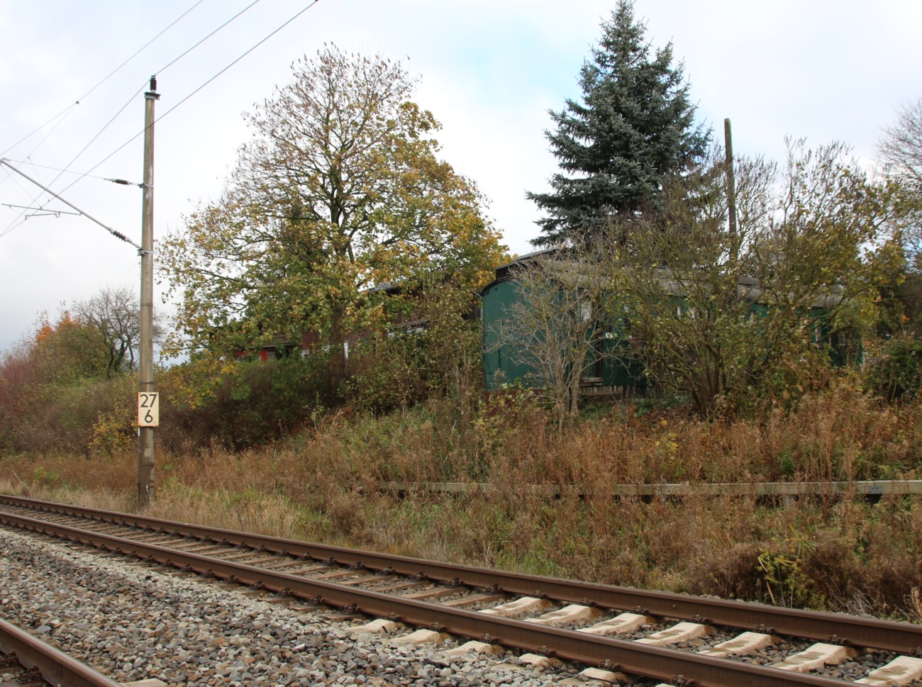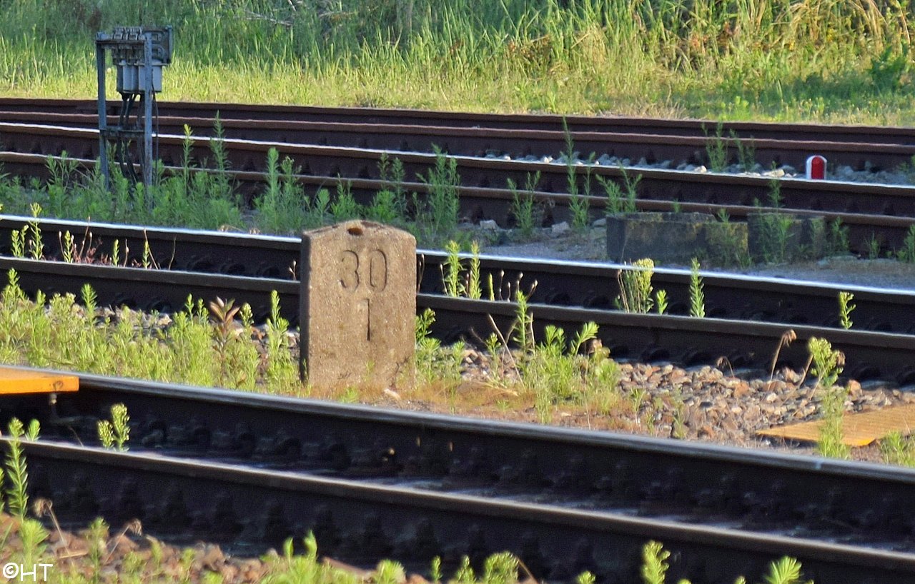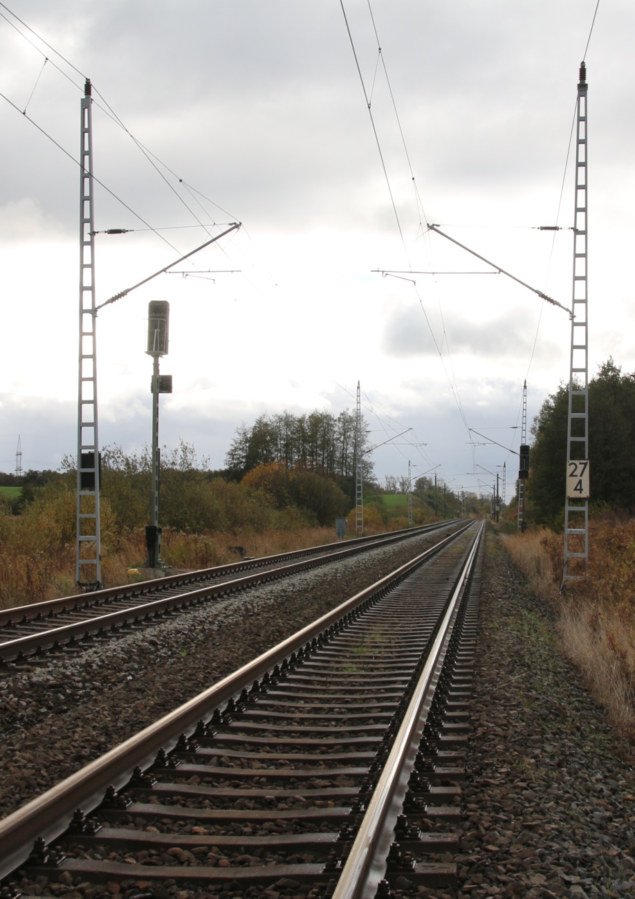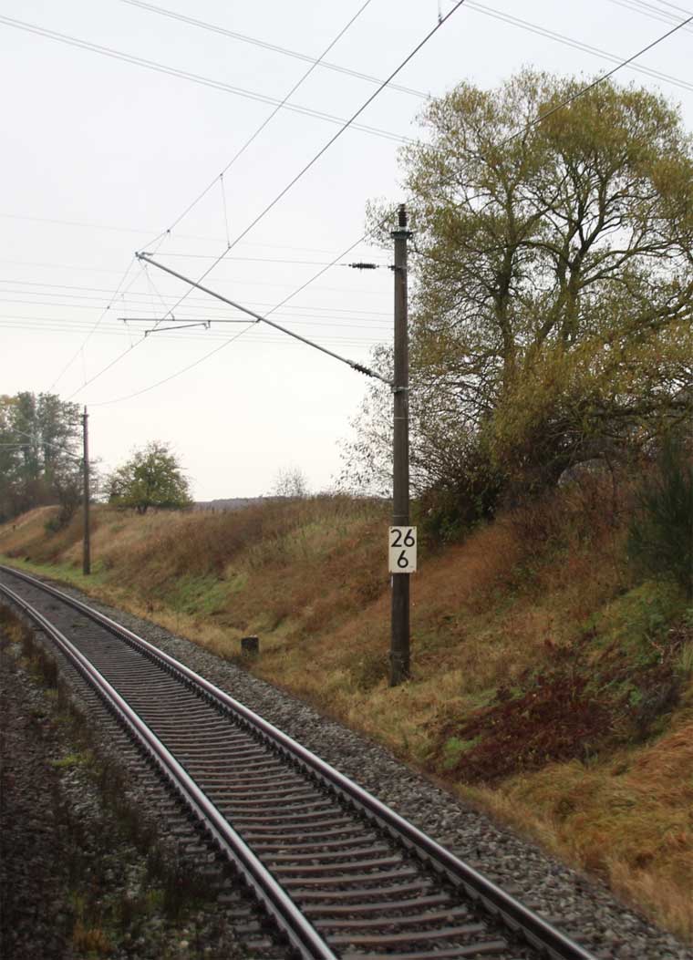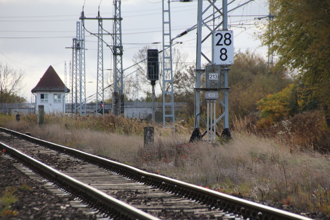 km 27,86 der abgehendenden Strecke Bützow -0,25 - Schwaan 14,10 - Dalwitzhof 27,86 - Rostock Hbf 30,50 (6446) mit weiterlaufender Kilometrierung (6446)