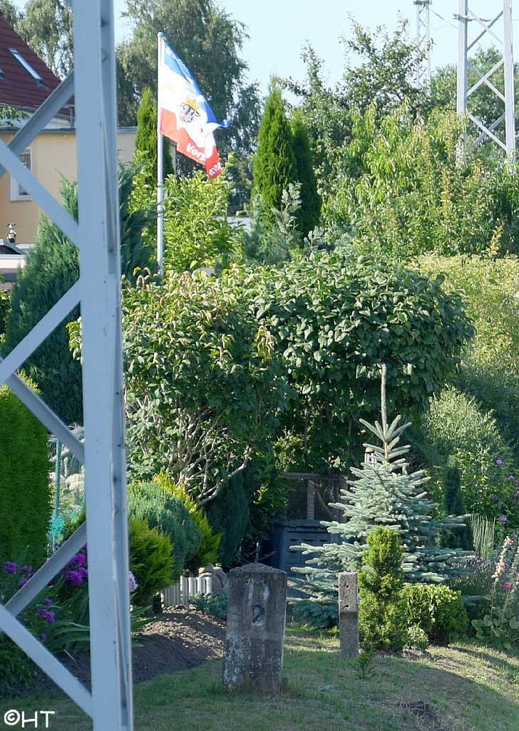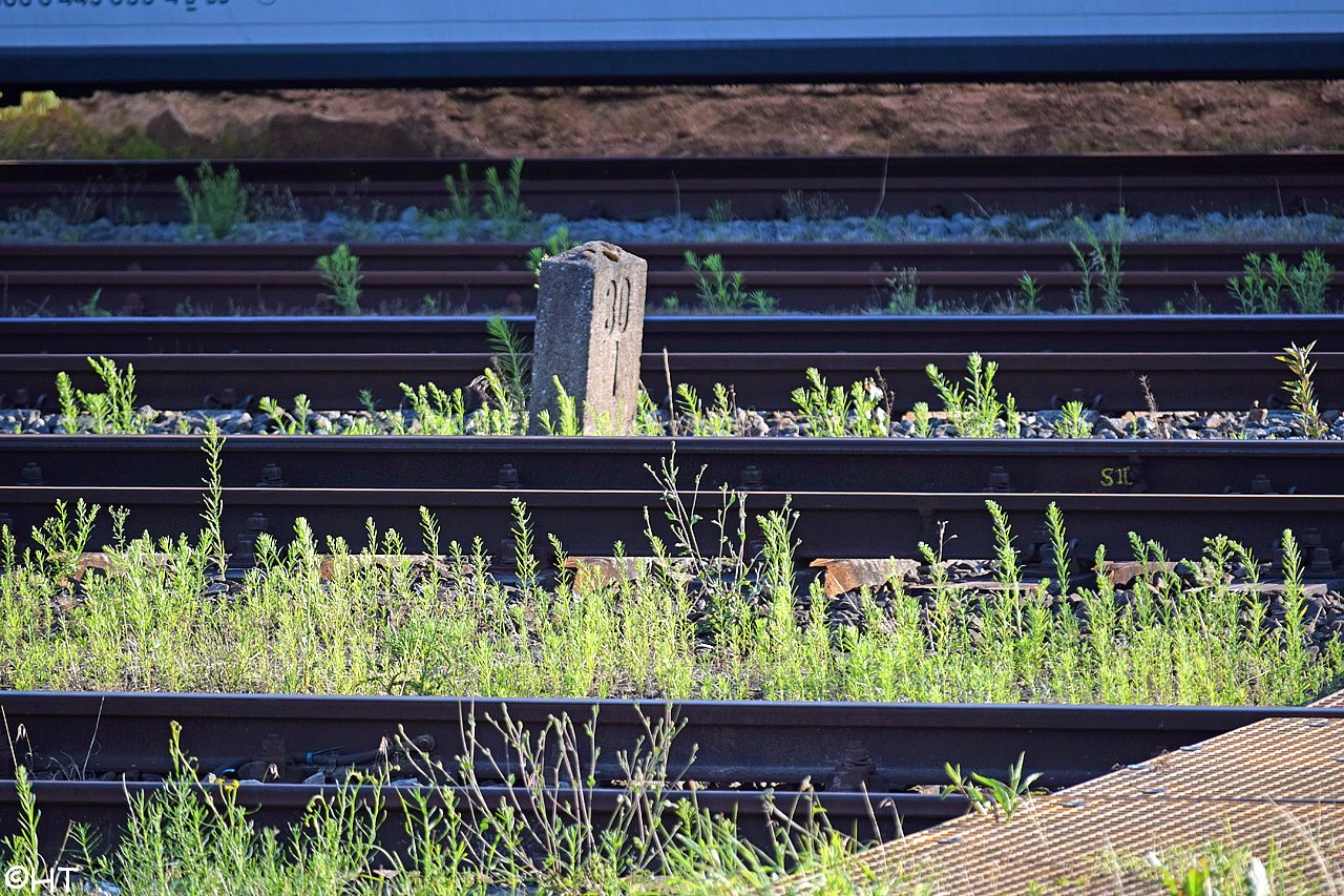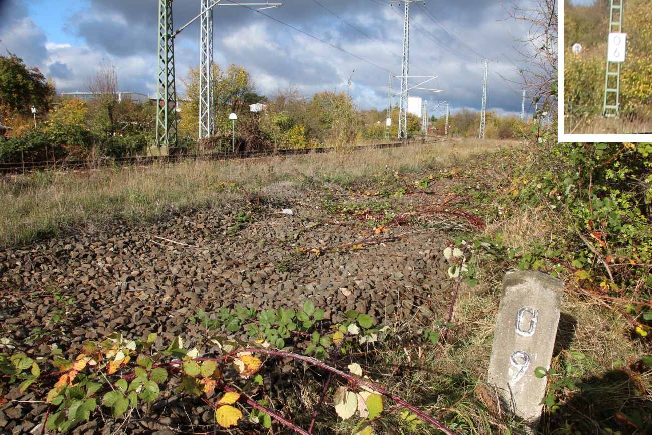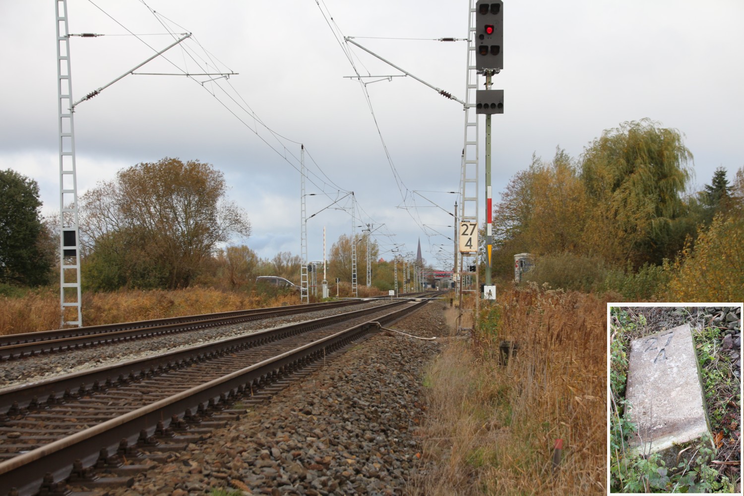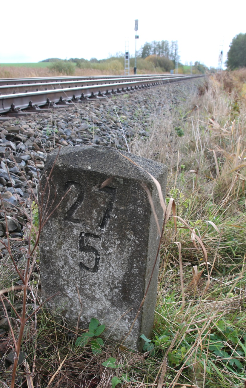 km 0,4 (Tafel und Stein) und km 0,5 (Stein) der Strecke
