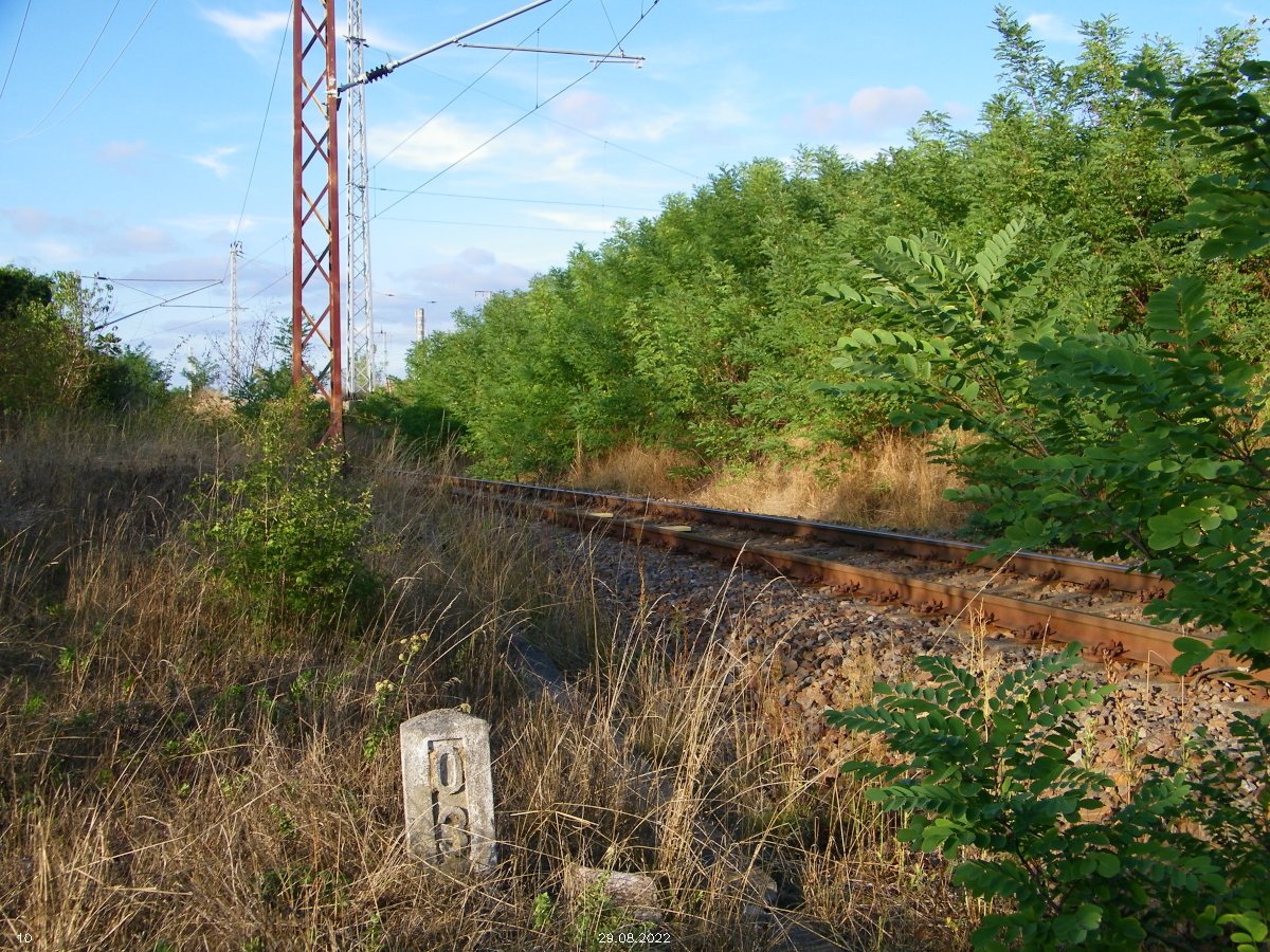 W 80, km -1,062 - Doberlug-Kirchhain ob Bf, W 6, km 1,018 (6190) Im Hintergrund km 102,2 der Strecke Berlin (Dresdner Bf)