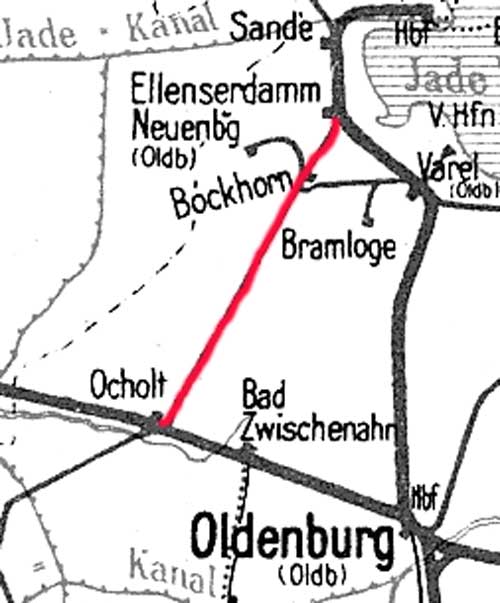 Bockhorn | 5,42 | km 11,02 der Strecke Varel (Old) 0,0 - Borgstede 4,01 - Neuenburg (Old) 19,03 - Streckenende 19,28 mit Zweigstrecke [Varel (Old) 0,0] - Borgstede 4,01 - Bramloge 7,65 |