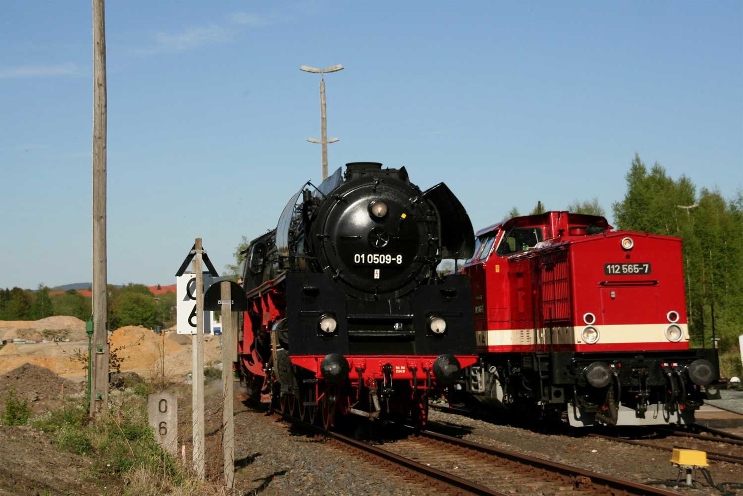 km 0,6 (Stein und Tafel) in Falkenstein (Vogtl) - 01 0509 und 112 565
