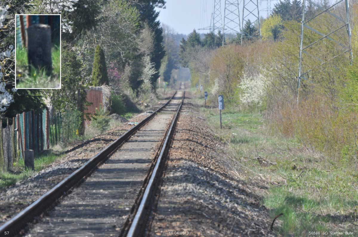 km 4,8 (Tafel) und km 4,9 (Stein links) - Blick Richtung Lauchhammer