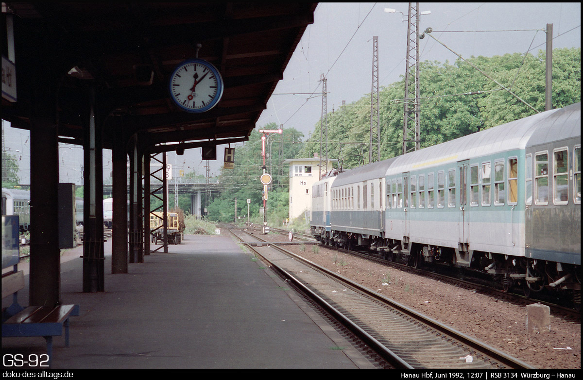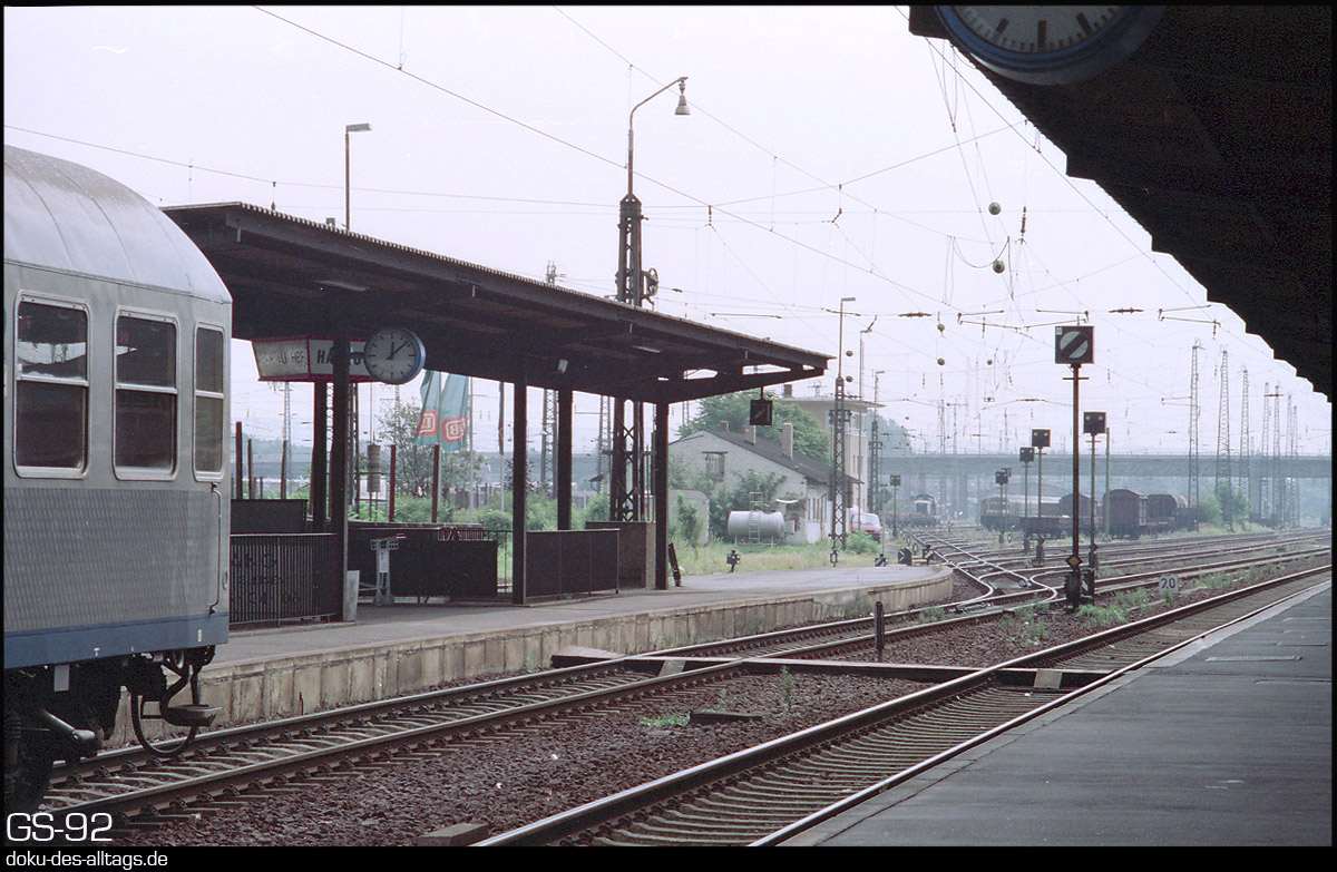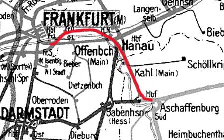 Hanau Hbf | 19,89 | km 22,92 der Strecke Frankfurt (Main) Hbf 0,0 - Hanau Hbf 22,98 - Schlüchtern 74,34 - (bis 1913: Elm 82,0 - Flieden 92,3) - (ab 1913 Distelrasentunnel) Flieden 85,240 = 92,195 (siehe auch Tabelle 5, Ziffer 3) - Fulda 110,57 - Bebra 166,667 - Eichenberg 227,37 - Göttingen 247,11 |