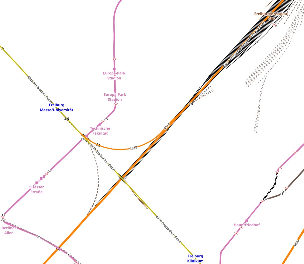 Freiburg-Neue Messe/Uni | 2,07 | km 4,79 der Strecke (Gundelfingen 0,03) - Freiburg (Breisgau) Gbf 3,73 - Freiburg-Neue Messe/Uni 4,79 |