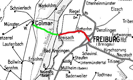 Freiburg (Breisgau) Hbf 0,015 - Breisach 22,50 - Staatsgrenze/Landesgrenze km 23,072 = km 21,55 - Kollmar (Els) Hbf 0,0 (1945)