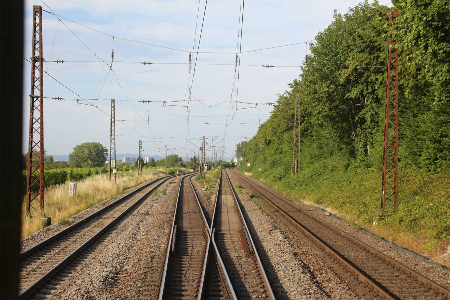 Rechts, etwas erhöht die Gleise der Strecke Mannheim Hbf - Basel Bad Bf - Konstanz