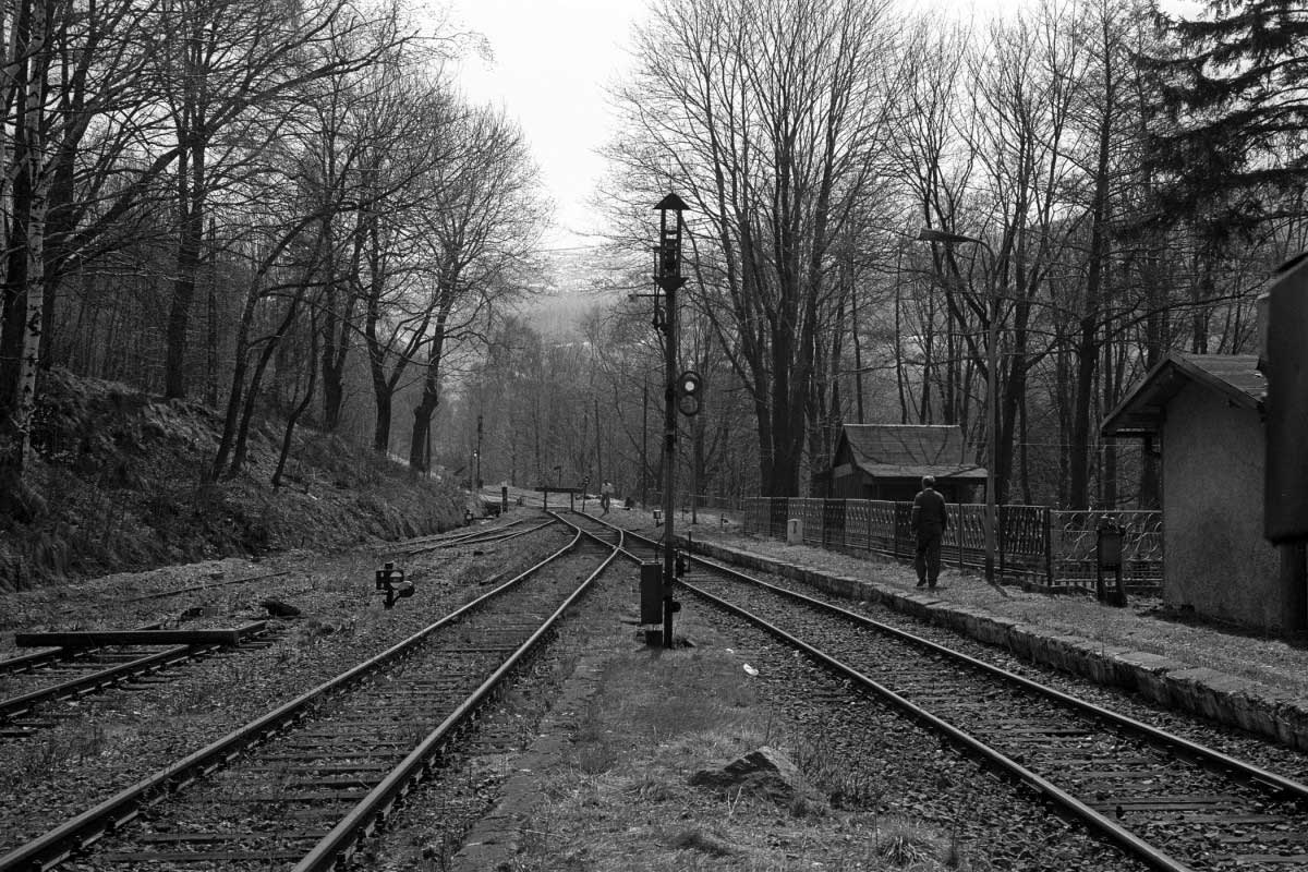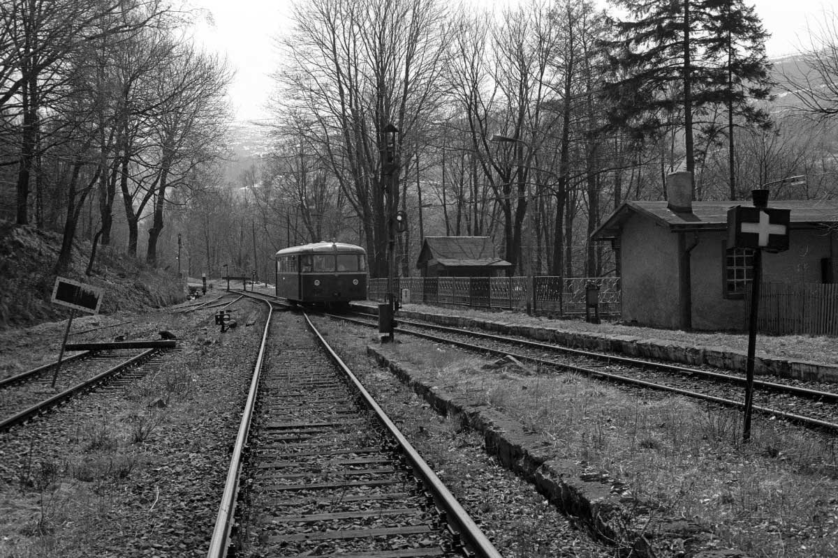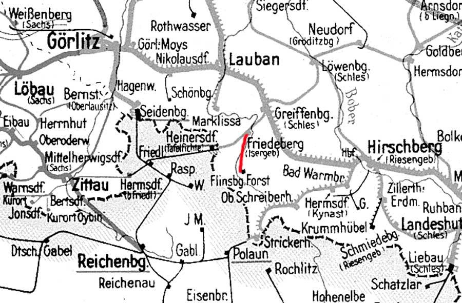 Friedeberg (Isergeb) 0,0 km 8,75 der Strecke Greiffenberg (Schles) 0,0 - Wigandsthal-Bad Schwarzbach 14,86 - Grenze Deutschland/Sudetengau 25,70 = [km 16,35 - Heinersdorf (Tafelfichte) 23,26 - Friedland (Isergeb) 0,0]