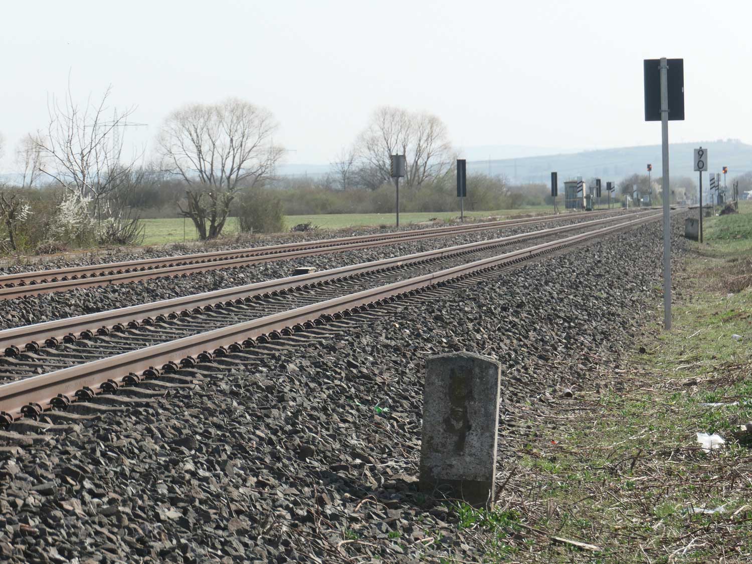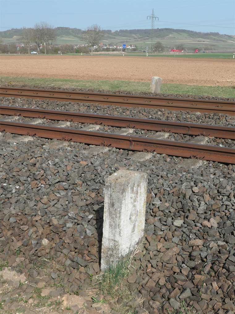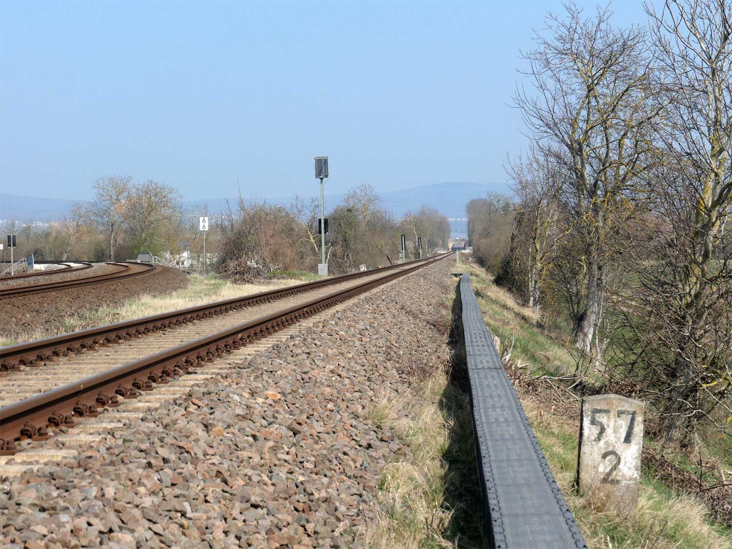 Rechts die Strecke Worms Hbf 0,0 - Monsheim 11,55 - Alzey 30,03 - Bingen (Rhein) 63,38