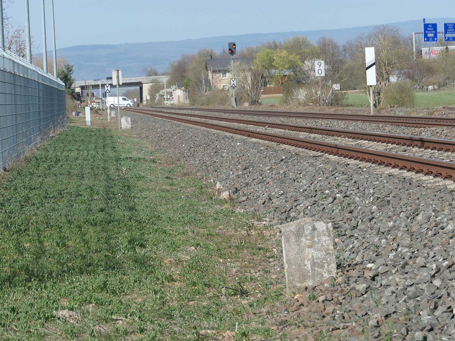 Gau-Algesheim 0,0 km 9,36 der Strecke [Köln Hbf -1,97/-1,44 - Koblenz Hbf 91,20 - Bingerbrück 151,90] - ehemalige Landesgrenze Preußen/Hessen 152,40 = km 0,0 - Bingen (Rhein) 0,97 - Mainz Hbf 30,58