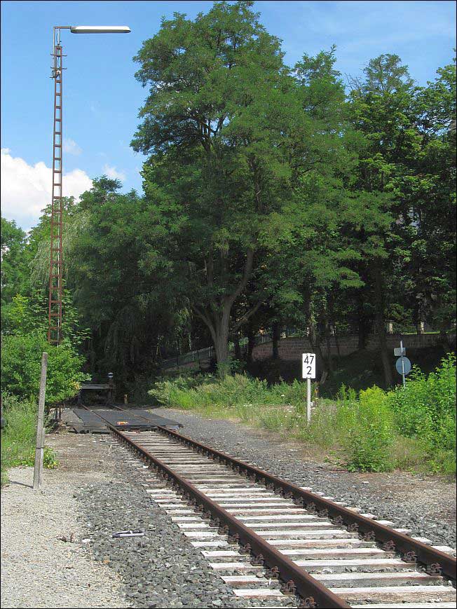 Dort wird gerade ein neues Gleis verlegt. Nach Inbetriebnahme des neuen Gleises wird das alte Gleis zurückgebaut.