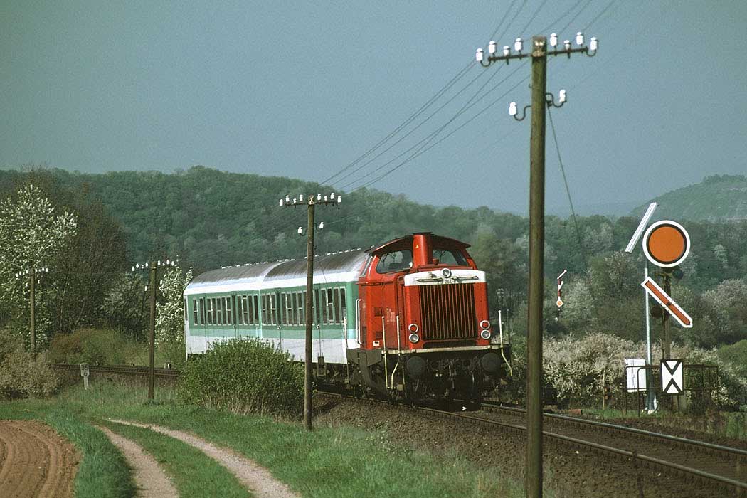 2x V 100 (212 372); 2x Telegrafenmast; 2x Kilometerstein und 2x Kilometertafel