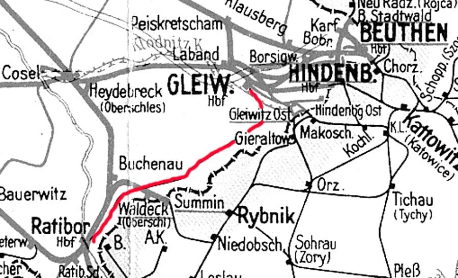 Gleiwitz Hbf 0,0 - Gleiwitz Trinneck 3,0 - Groß Rauden 24,99 - Ratibor Siemens 50,40 (Schmalspurige Kleinbahn Gleiwitz - Rauden - Ratibor)