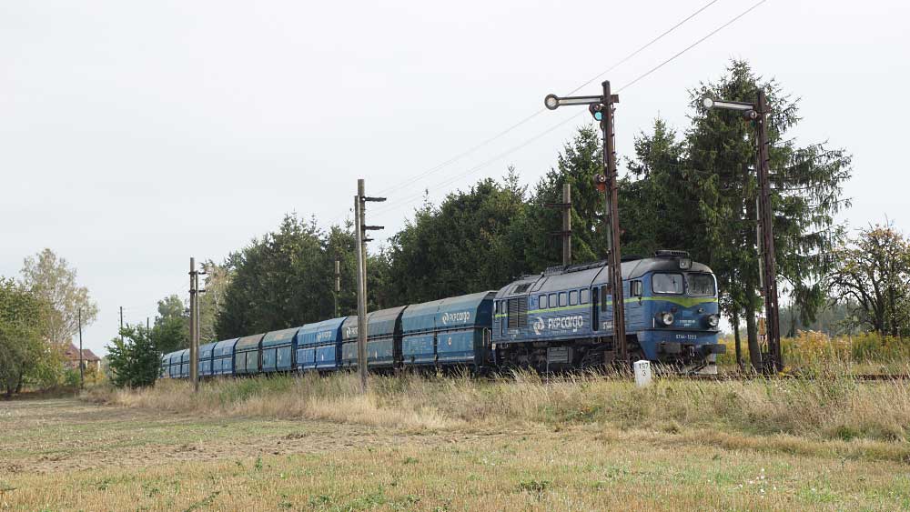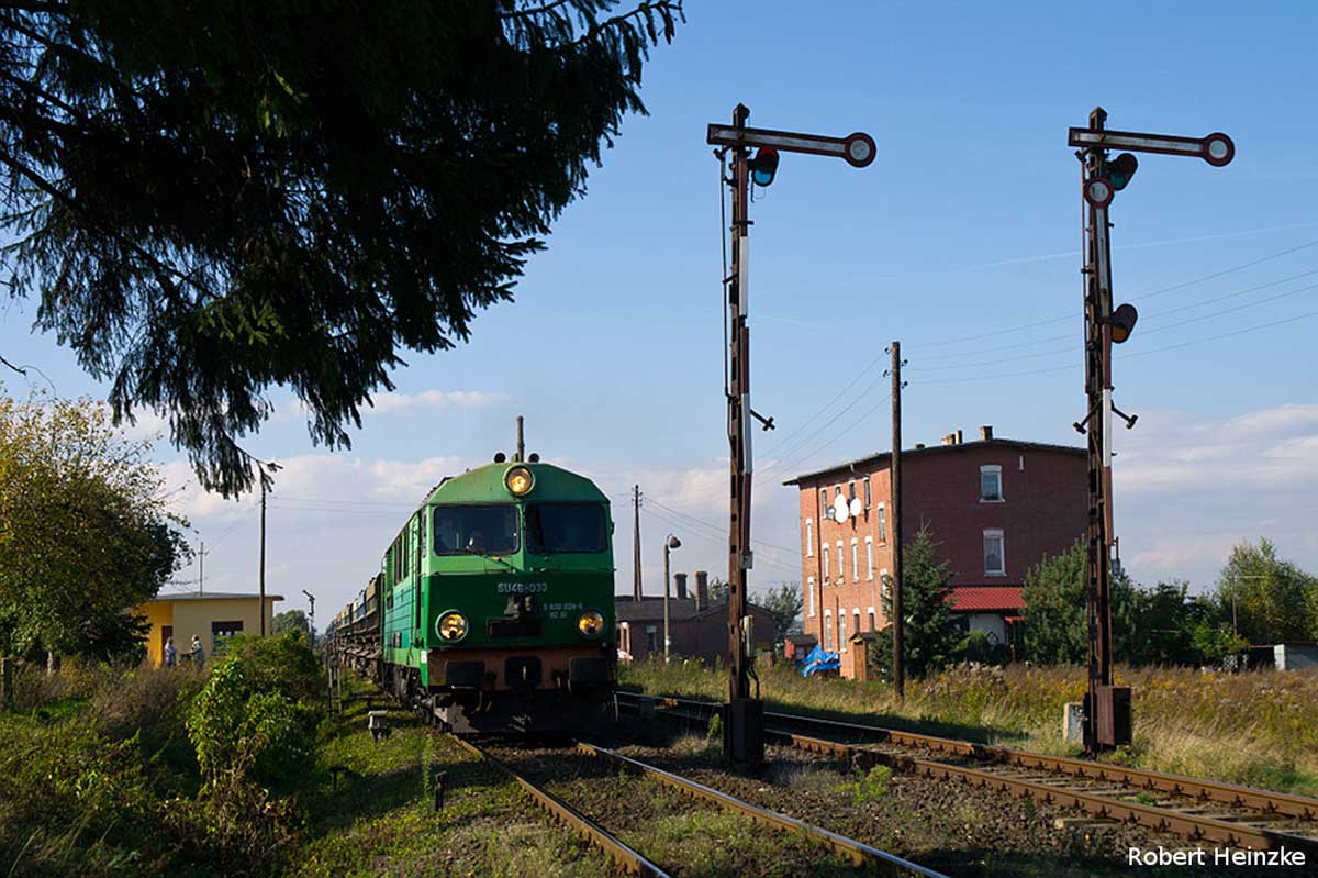 km 196,7 - SU46-033 mit einem leeren Schotterzug nach Sulikow in Jerzmanki