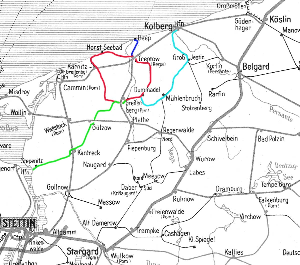 Chausseehaus [b Greifenberg (Pommern)] 0,0 - Karnitz (Kreis Greifenberg Pommern) Landesbahnhof 18,7 - Treptow (Rega) Landesbahnhof 49,0 - Dummadel 75,3 - Greifenberg (Pommern) Landesbahnhof 85,4