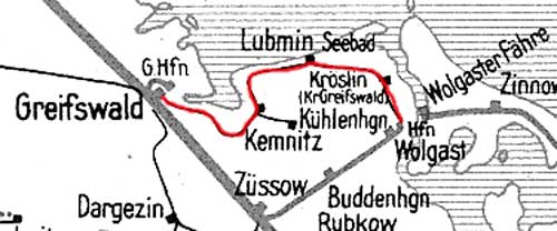 Greifswald 0,0 - Kemnitz 18,48 - Lubmin Dorf 30,36 - Kröslin 41,16 - Wolgast Kleinbf 48,75 (bis 1945)
