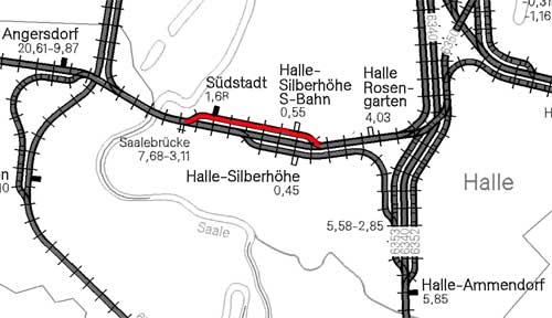 Abzw Halle-Saalebrücke | 3,11 | km 7,68 der Strecke Halle (Saale) Hbf 0,01 - Sangerhausen 59,21 - Nordhausen 97,07 - Leinefelde 139,37 - Eichenberg 170,51 - Hannnoversch Münden 193,54 (6343) |