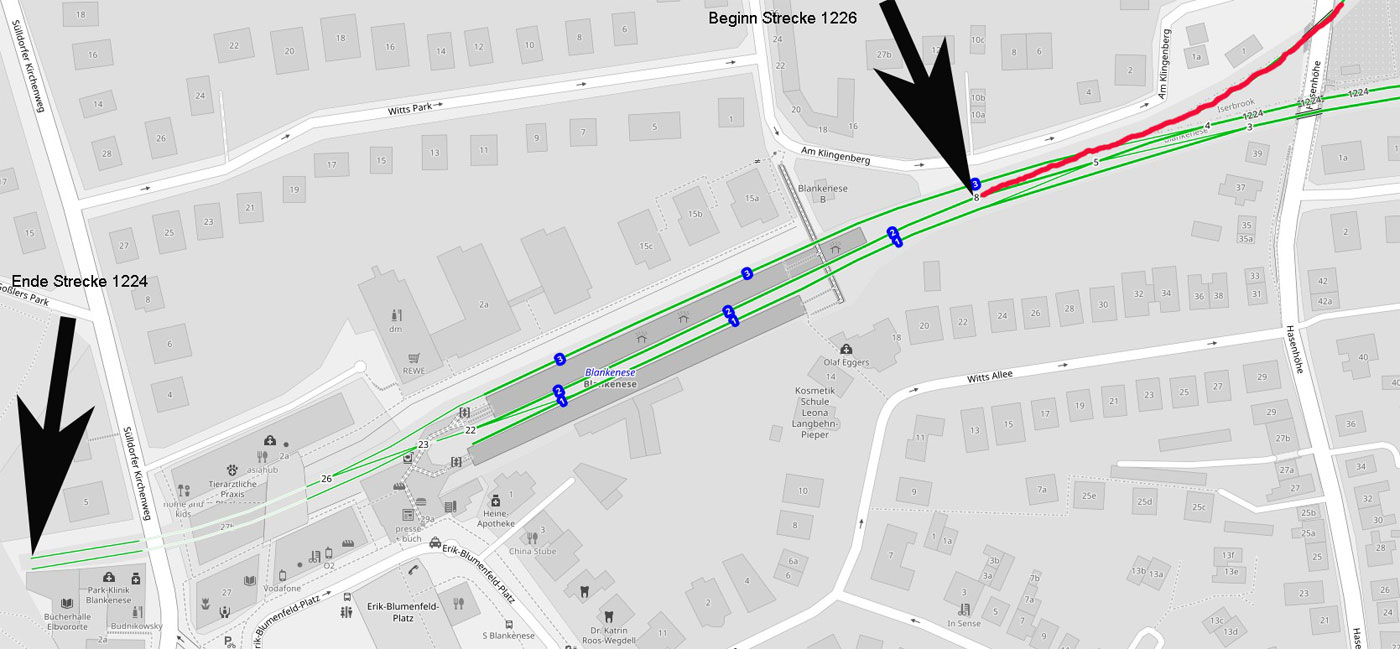 dieser Streckenteile auf andere Anwendungen. Auf Grund dessen wird die Strecke im Kopfbahnhof Hamburg-Blankenese gebrochen und mit einer neuen Streckennummer, jedoch mit derselben Kilometrierung weitergeführt. |