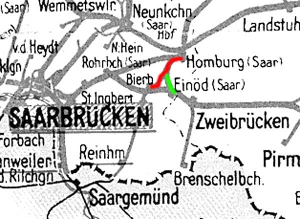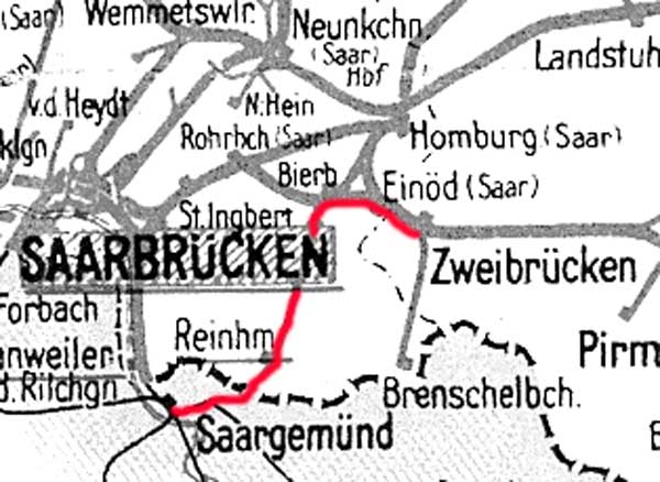 Zweibrücken Hbf 0,0 - Bierbach 6,87 - Reinheim (Saar) 24,27 - Grenze Deutschland/Frankreich 25,087 - Sarreguemines (Saargemünd) 36,80 (1948)