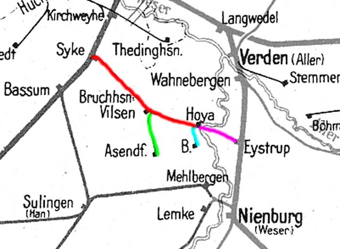 1950 wurde der Streckenabschnitt Hoya - Bruhhausen-Vilsen - Syke auf Normalspur umgebaut. |