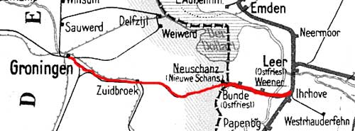 Ihrhove 0,0 - Staatsgrenze km 17,479 = [km 127,6 - Nieuweschans 126,8 (Neuschanz 18,35) - Groningen