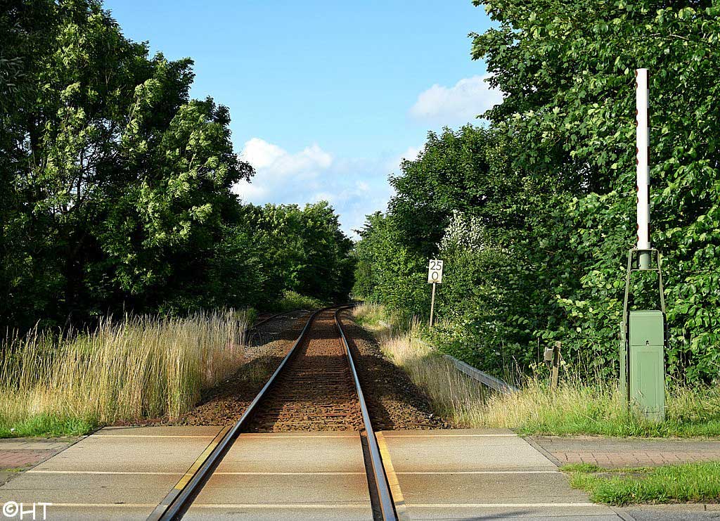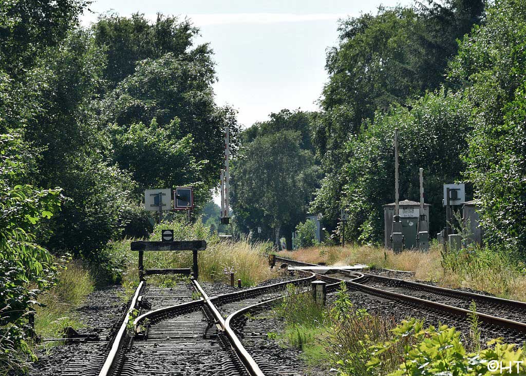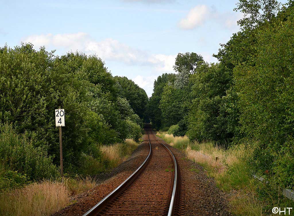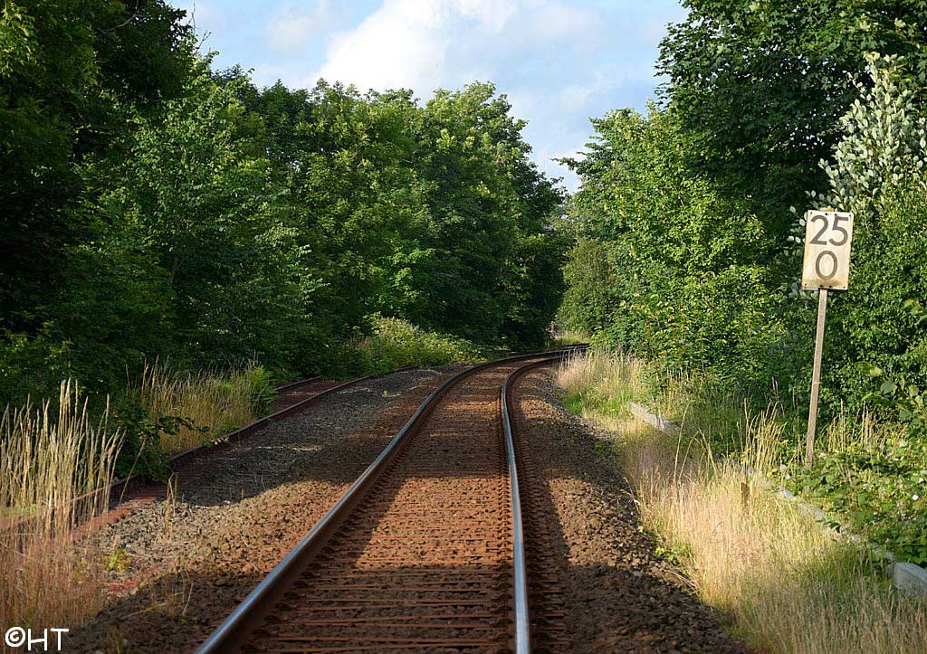 Links das Gleis der ehemaligen Strecke Husum 0,0 - Flensburg Weiche 45,50 - Flensburg 48,82