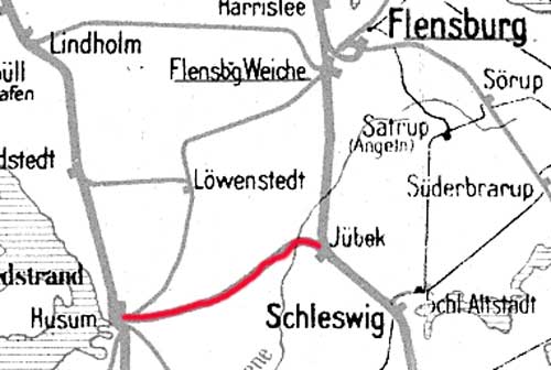 Husum 26,30 km 121,84 der Strecke Elmshorn 0,07 - Itzehoe 34,17 - Heide (Holst) 88,30 - Husum 121,84 - Lindholm 157,62 - Niebüll 162,02 -Grenze Deutschland/Dänemark km 175,29 = [km 67,9 - Tønder (Tondern) 63,3 - Bramminge 0,0]