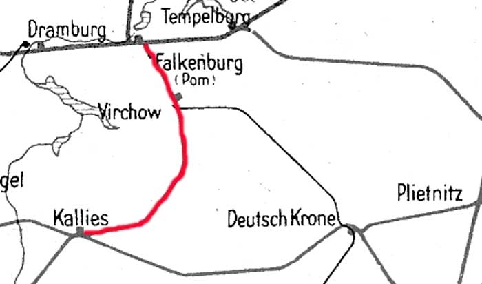 Falkenburg (Pom) 40,40 km 35,39 der Strecke Ruhnow 0,0 - Neustettin 88,00 - Deutsch Briesen 142,04 - Konitz (Westpr) 149,2