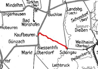 Schongau | 31,05 | km 28,71 der Strecke Kaufering 0,0 - Landsberg (Lech) 4,831 = km 0,0 - Schongau 28,71 (auch Angabe Schongau 33,538 von Kaufering) |
