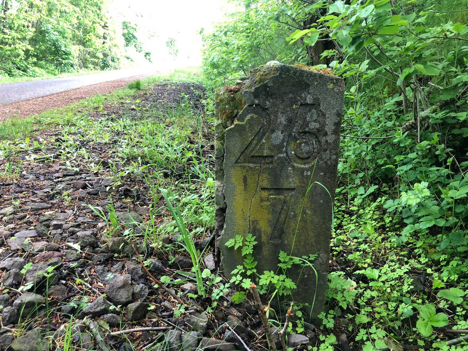 Links hinter dem Zugschluss ist km 31,7 zu erkennen