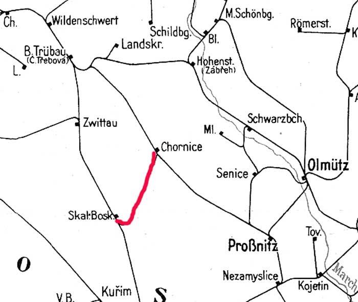 Kornitz 0,0 - Grenze Sudetenland/Protektorat Böhmen und Mähren 4,9 - Gewitsch-Jaromierschitz / Jevíčko-Jaroměřice 6,055 - Skalitz (Zwittawa) Kleinbahnhof / Skalice nad Svitavou místní nádraží 32,493