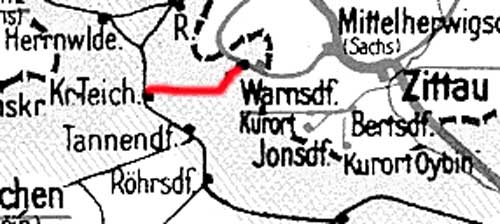Varnsdorf (Warnsdorf) | 11,047 | km 10,098 der Strecke Mittelherwigsdorf (Sachs) 0,0 - Staatsgrenze Deutschland/Tschechien 9,688 - Varnsdorf 10,098 - Staatsgrenze Tschechien/Deutschland 13,705 - Eibau 23,45 (MWE) |