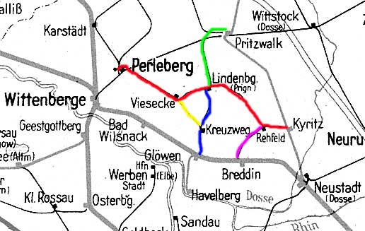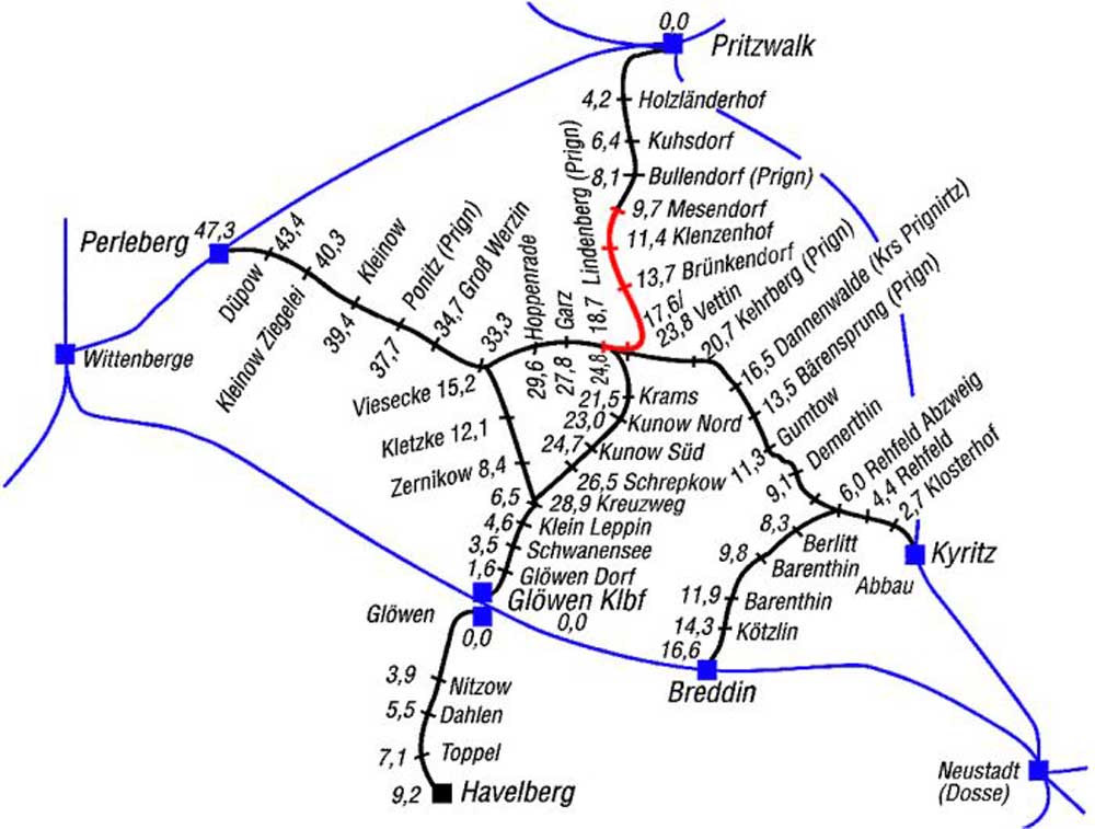 Kyritz 0,0 - Rehfeld (Prign) Abzw 6,0 - Lindenberg (Prign) 24,83 - Viesecke 33,29 - Perleberg 47,28 (1967)
