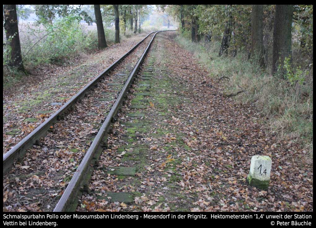 km 0,0 der Strecke Lindenberg (Prignitz) 0,0 - Vettin 1,1 - Mesendorf 8,96 - Pritzwalk 18,7 | ||