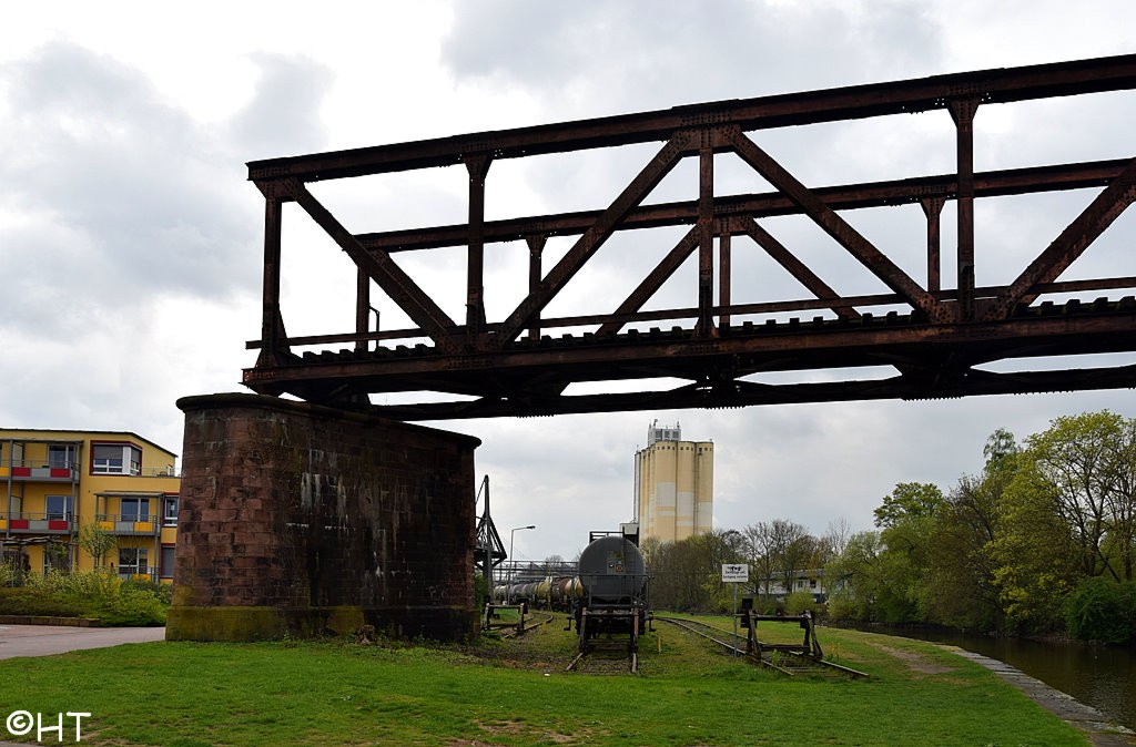 Unter der Brücke die ehemalige Hafenbahn