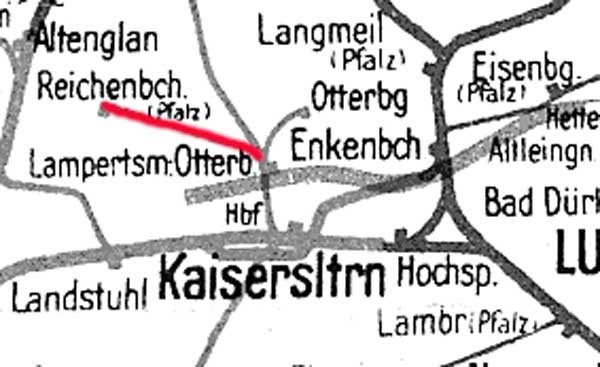 Auszug Streckenkarte 1938 Quelle: [1] Stand der Kilometrierung: 1951 Lampertsmühle-Otterbach 0,0 - Reichenbach (Pfalz) 16,43 Stand der Kilometrierung: 1980 Lampertsmühle-Otterbach 0,0 - Reichenbach (Pfalz) 16,43