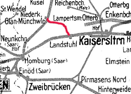 Glan-Münchweiler 13,87 km 21,76 der Strecke Homburg (Saar) 0,0 - Schönenberg-Kübelberg 10,46 - Glan-Münchweiler 21,76 - Altenglan 31,93 - km 33,05 = km 56,89 - Odernheim (Glan) 93,28 - Staudernheim 96,85