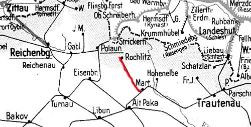Märzdorf (Böhmen) / Martinice 0,0 - Grenze Protektorat Böhmen und Mähren/Sudetengau 10,57 - Rochlitz (Iser) 20,19