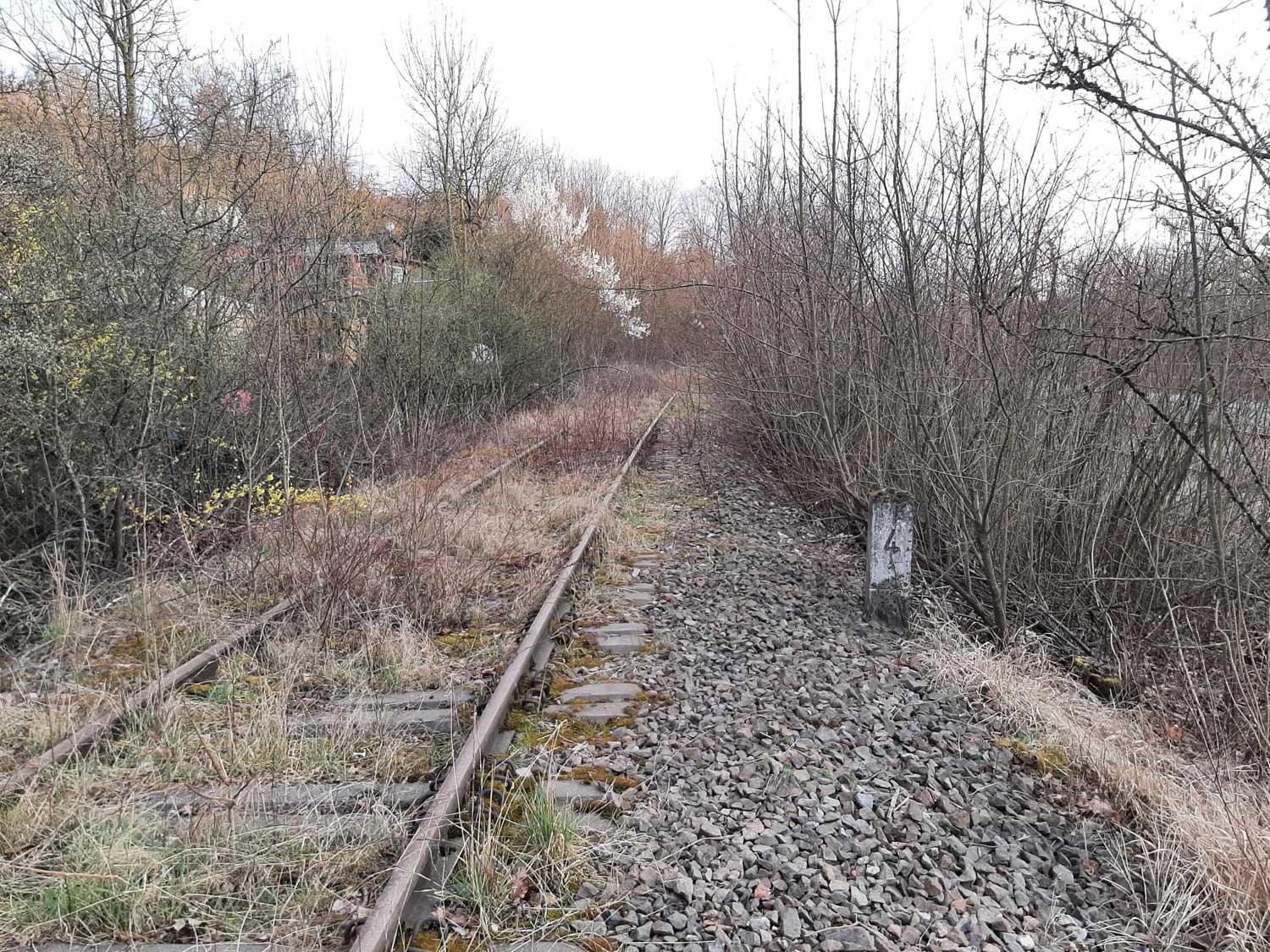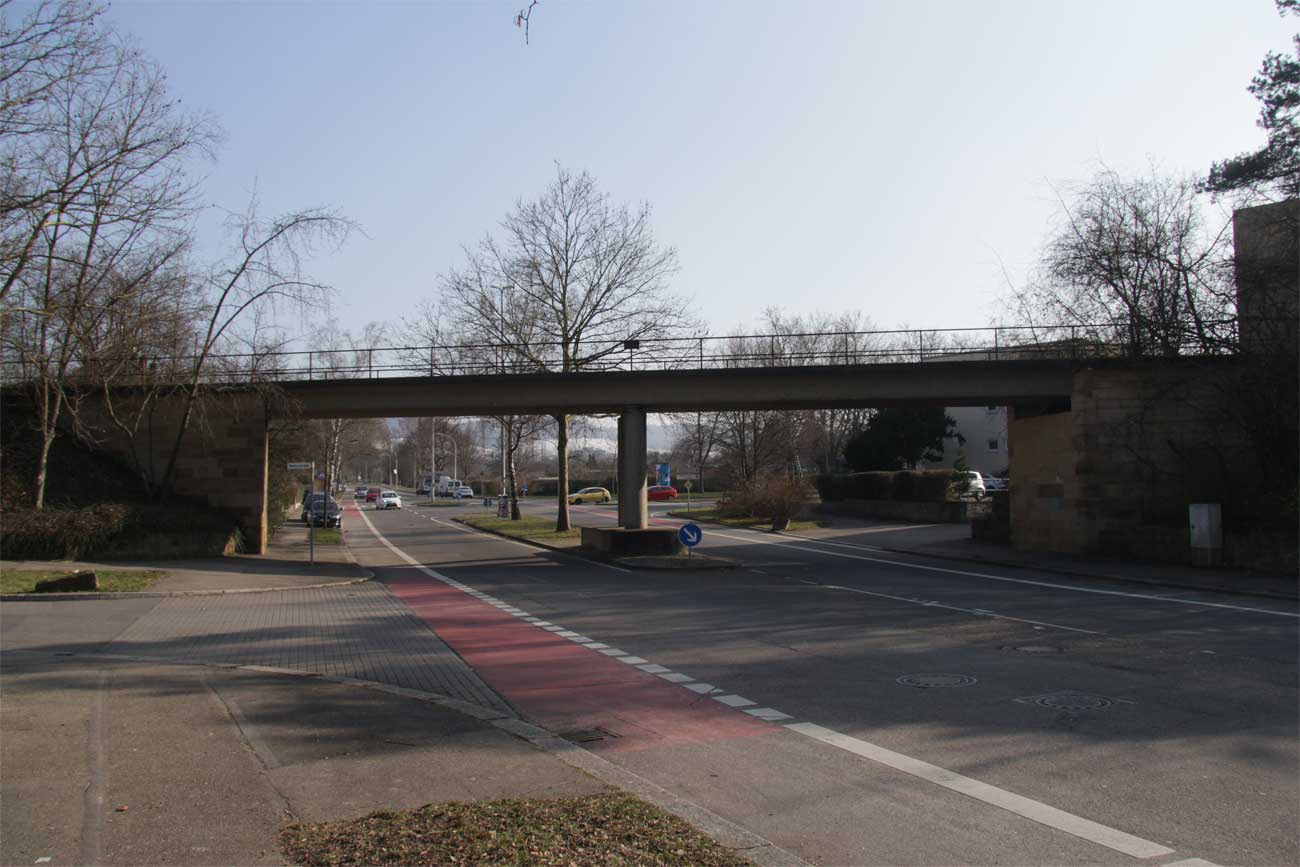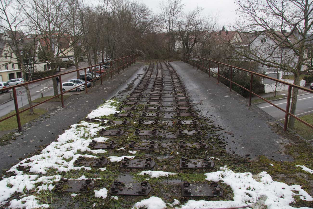 Überreste des Dreischienengleises in Heilbronn auf der Brücke über die Sontheimer Landwehr - Blick Ri Norden