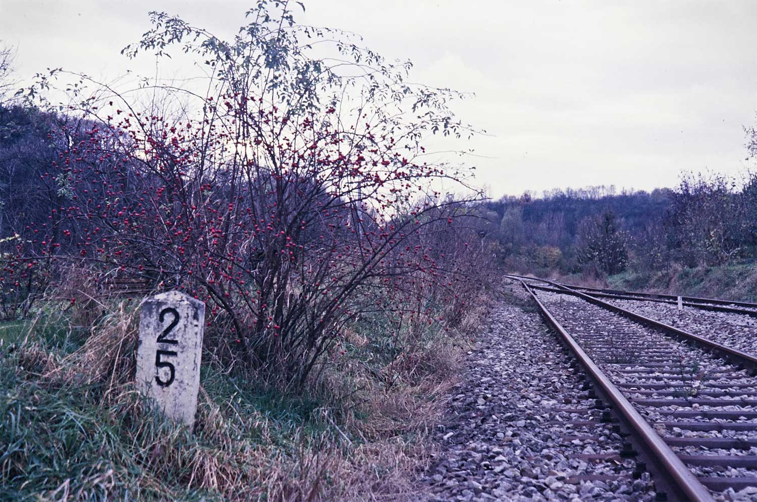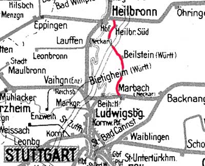Marbach (Neckar) 0,0 - Steinheim (Murr) 4,26 -Streckenunterbrechung - Heilbronn-Sontheim 32,32 - Heilbronn Süd 34,25 - Abzw Pfühl 37,02 (früher Spurweite 750 mm, teilweise Dreischienen-Gleis) (1981)