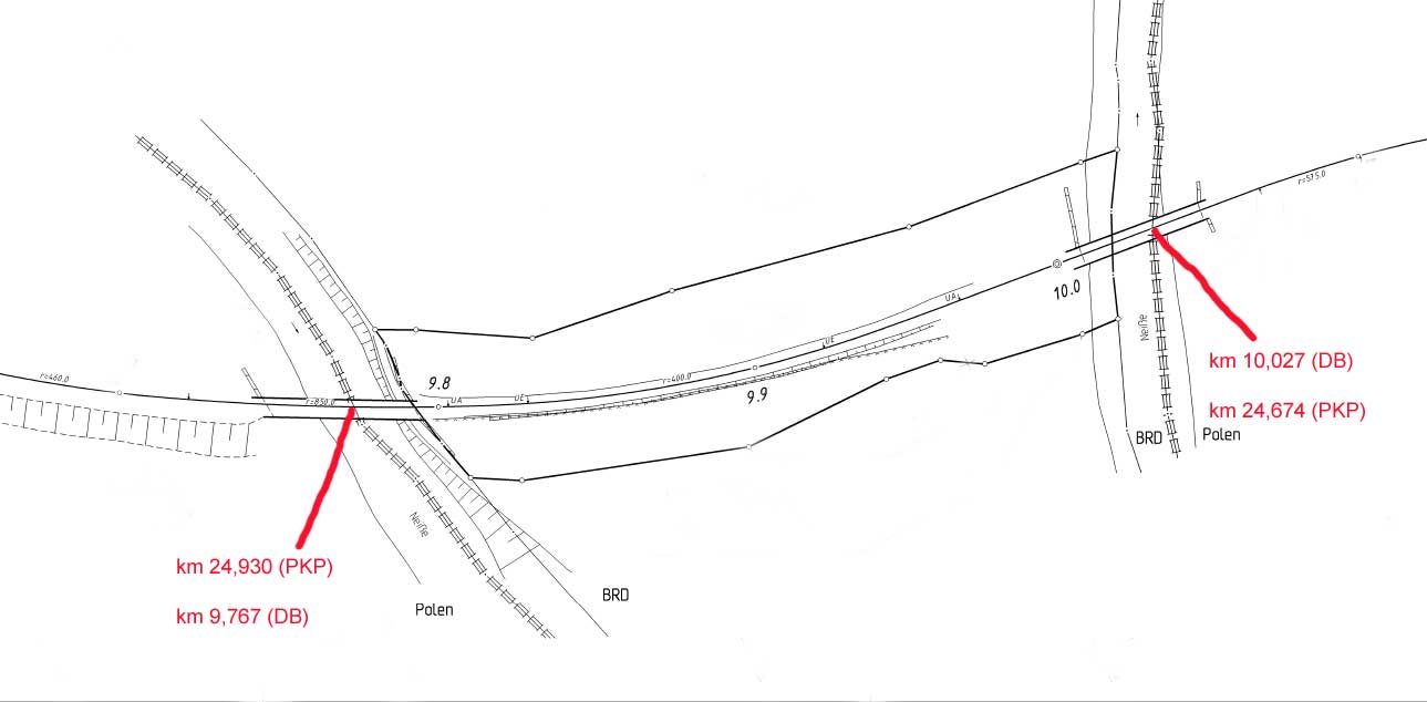 26,117 km 0,0 der Strecke Abzw Trzciniec Zgorzelecki 0,031 - Staatsgrenze Polen/Deurschland 0,200 - (Zittau)
