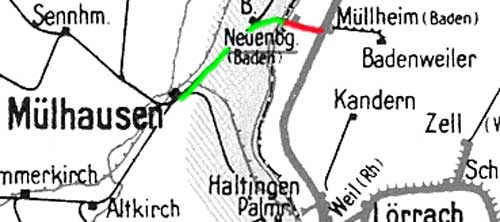 Müllheim (Baden) 0,0 - Neuenburg (Baden) 3,32 - Grenze Deutschland/Frankreich 4,592 = km 17,548 - Bantzenheim (Banzenheim) 14,330 - Mulhouse-Ville [Mülhausen (Els) Hbf] 0,0