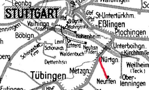 Nürtingen | -0,5 | km 12,57 der Strecke Plochingen 0,0 - Nürtingen 12,57 - Reutlingen Hbf 34,72 - Tübingen 49,02 - Horb 80,32 - Rottweil123,27 - Tuttlingen 151,16 - Immendingen 161,01 |