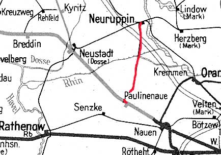 bis 1930: Paulinaue 0,0 - Neuruppin Paulinauer Bf 29,8 mit einer seit 1905 errichteten Verbindungsstrecke zum Bf Neuruppin