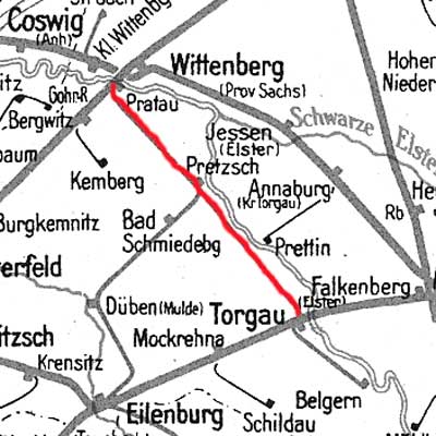 Torgau | 41,87 | km 77,02 der Strecke Halle (Saale) Hbf -0,30 - Eilenburg 49,27 - Falkenberg (Elster) (oben) 95,04 - Cottbus 173,86 - Guben 211,53 |