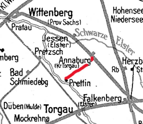 Annaburg West 12,5 Verbindungsgleis zum Bf Annaburg: km 170,09 der Strecke Kohlfurt - Hoyerswerda - Falkenberg (Elster) - Wittenberg (Provinz Sachsen) [heute: Lutherstadt Wittenberg] - Dessau-Roßlau [heute: Roßlau (Elbe)]