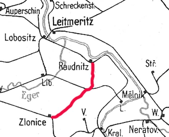 Raudnitz (Elbe) / Roudnice nad Labem 0,0 - Straschkow / Straškov 14,520 - Slonitz / Zlonice 32,665